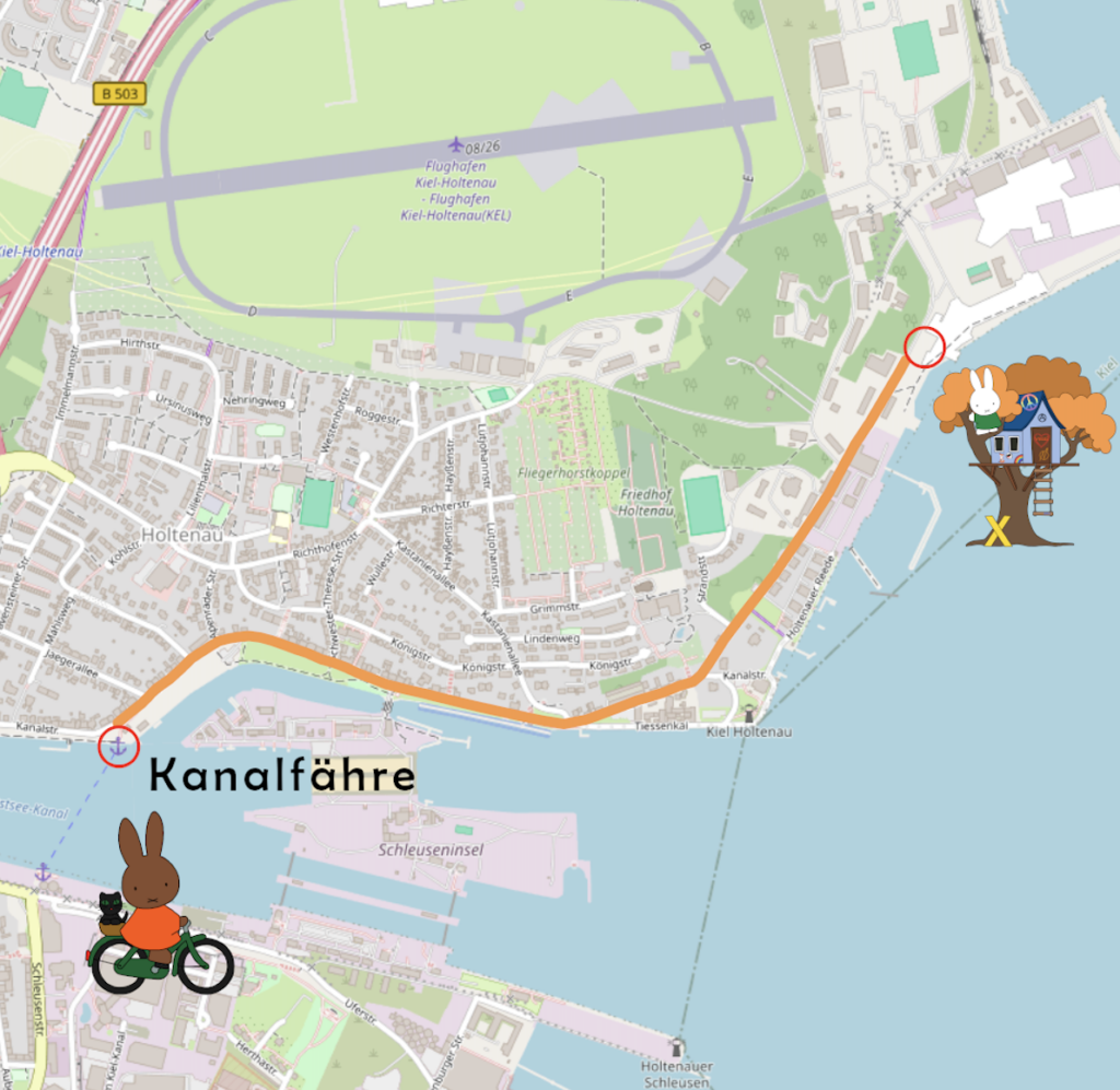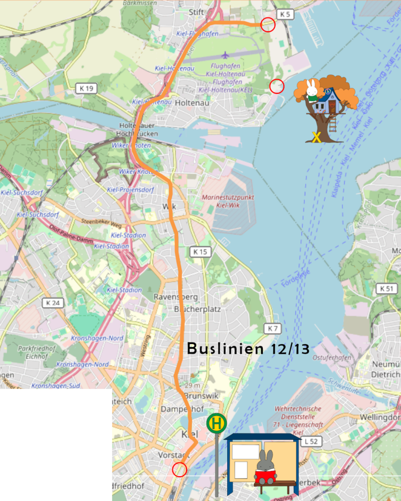 Für die Anreise mit den Öffis könnt ihr vom Hauptbahnhof Kiel mit den Bus Linien 12 (in Richtung Schilksee) oder 13 (in Richtung Strande) starten. Diese fahren Werktags tagsüber alle 10 min ab. Die Fahrt selbst dauert 30 min. Beide Linien halten an der Haltstelle „Schusterkrug“, von dort aus sind es noch 10-15 Minuten zu gehen bis zur Plattform.