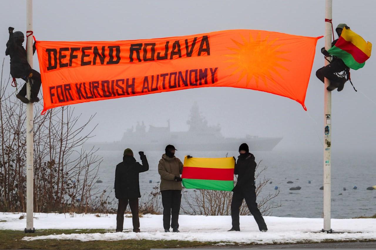 Kiel. Am 11.02.2026 gegen 8:00 Uhr hissten sechs Aktivist*innen der Gruppe ‚MFG-5 bleibt zivil!‘ ein Transparent mit der Aufschrift ‚Defend Rojava – for kurdish autonomy‘. Dafür erkletterten sie zwei Fahnenmaste am Ufer des ehemaligen MFG-5 Geländes. Mit kurdischen Rojava-Flaggen protestierten sie in Sichtweite der einfahrenden türkischen Marineschiffe ‚Anadolu‘, ‚Oruç Reis‘ und ‚Istanbul‘ gegen das NATO-Manöver ‚Steadfast Dart‘ und die türkische Beteiligung daran. Die Aktivist*innen rufen zur Solidarität mit den Menschen in der demokratisch-selbstverwalteten Region Rojava in Nordostsyrien auf.